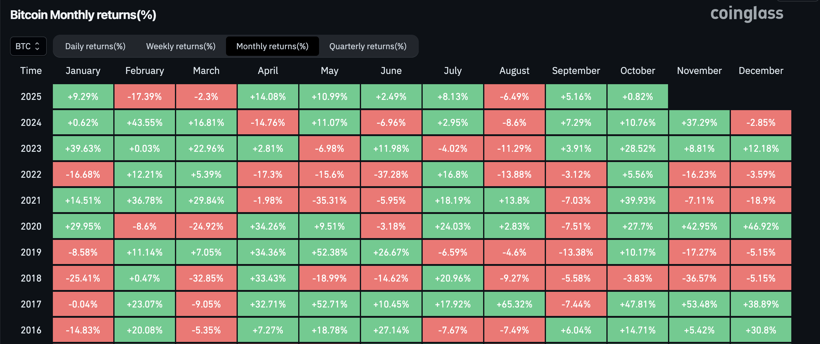 Bitcoin Monthly returns trở lại mức xanh +0.82%. Theo Coinglass