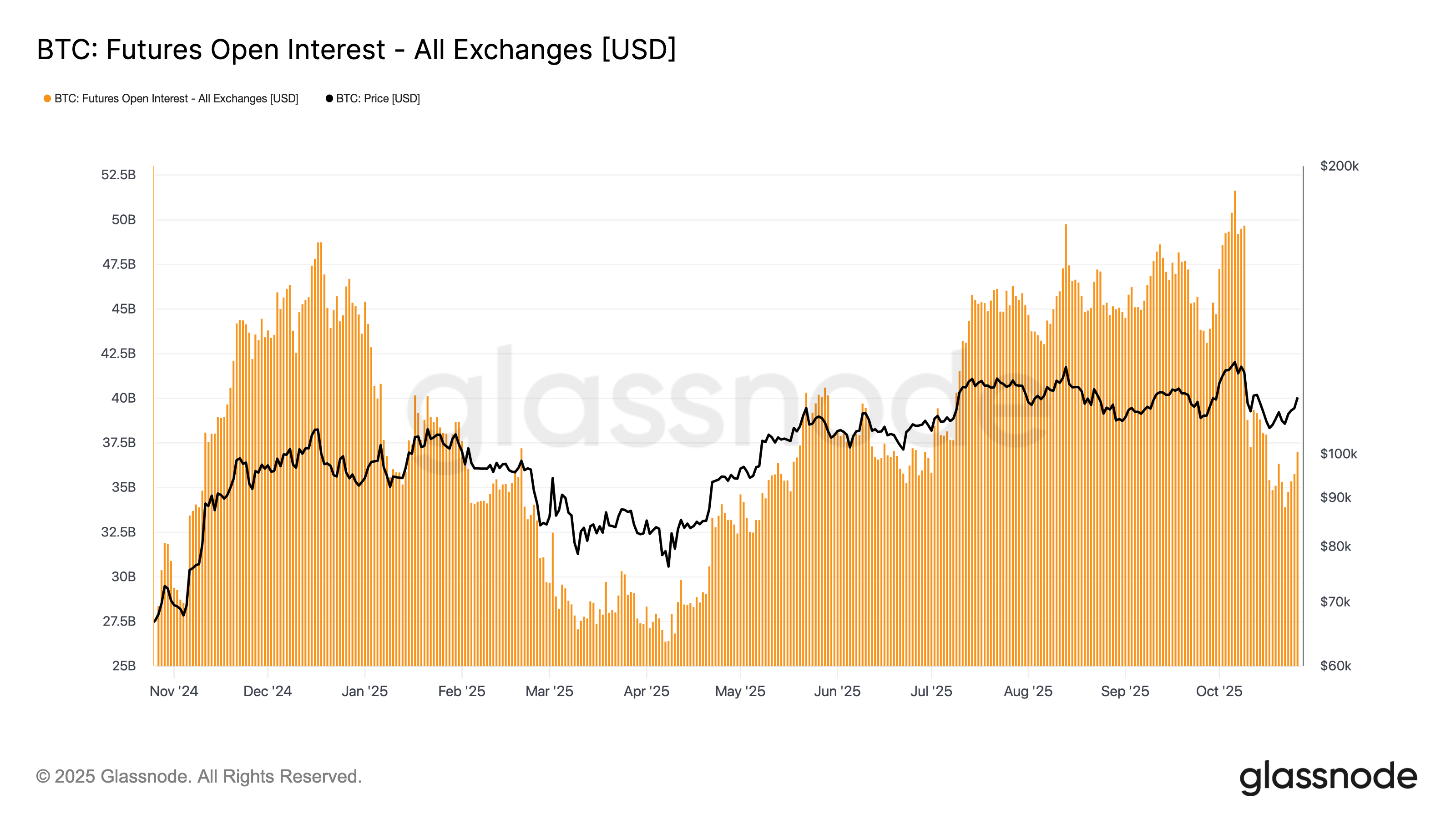 BTC: Futures Open Interest bắt đầu hồi phục ~ 10% kể từ mức thấp nhất ngày 22/10. Theo Glassnode