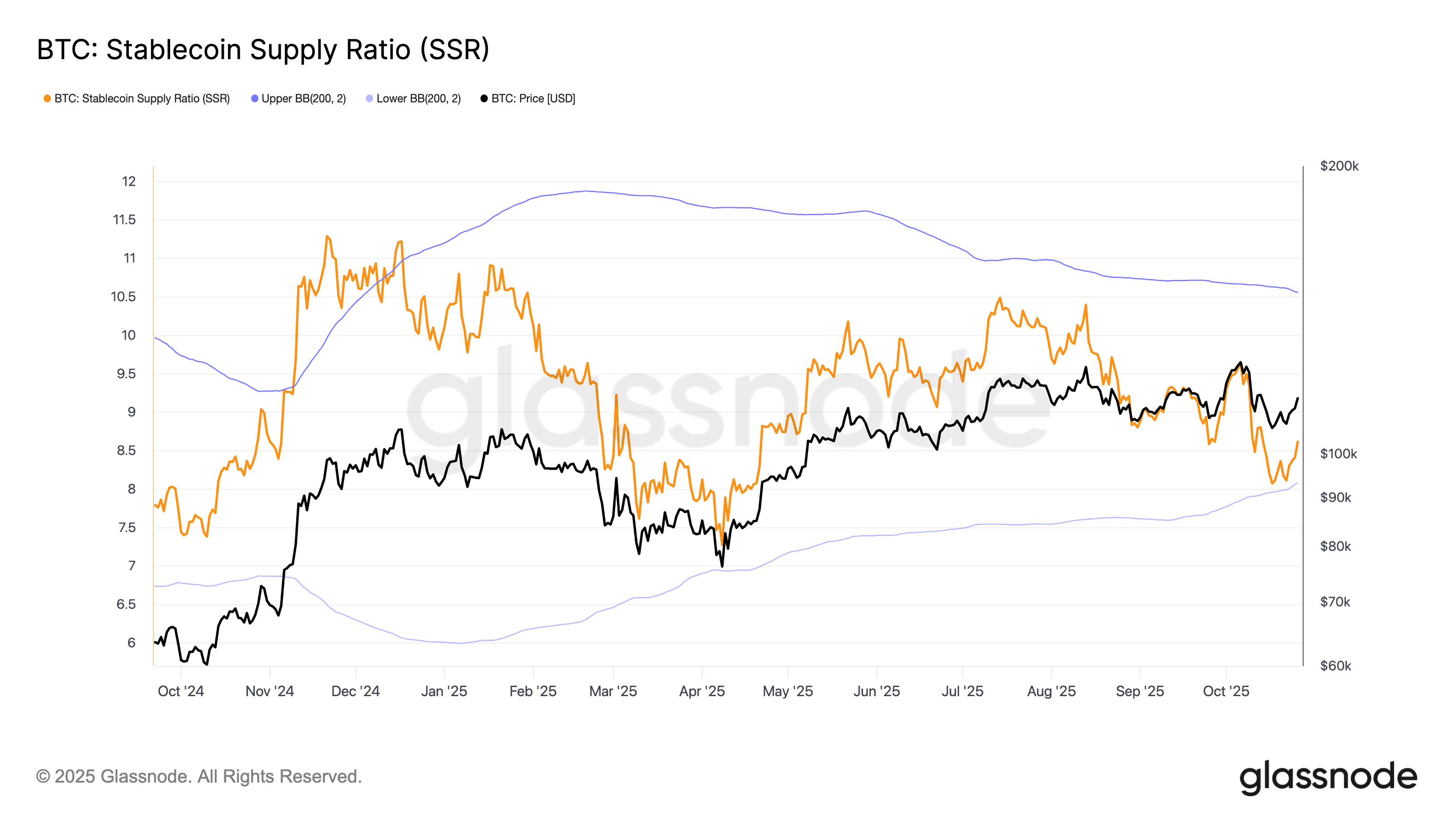 Chỉ số BTC: Stablecoin Supply Ratio (SSR) sau khi chạm vùng Low của Bollinger Band đã hồi phục lại cùng với giá $BTC.