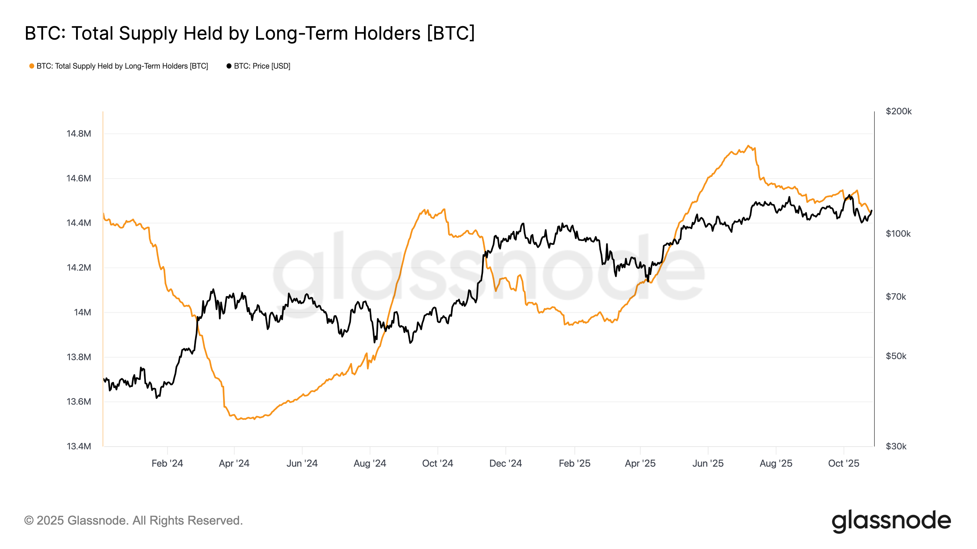 Nhóm Long-Term Holders vẫn giữ xu hướng phân phối của mình từ tháng 7/2025. Theo Glassnode