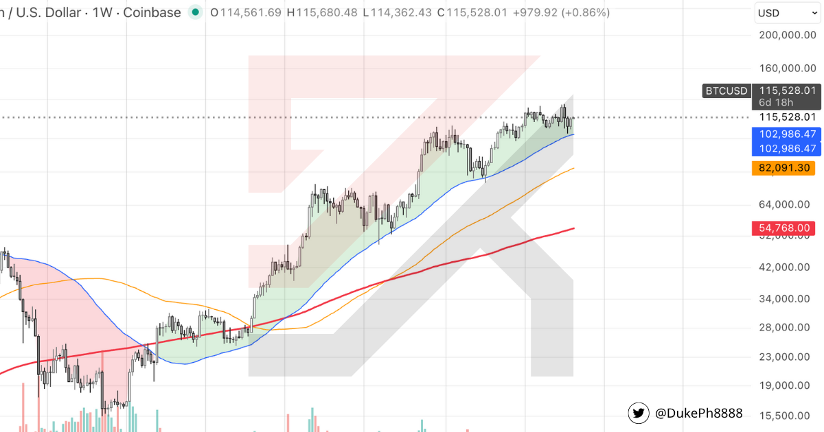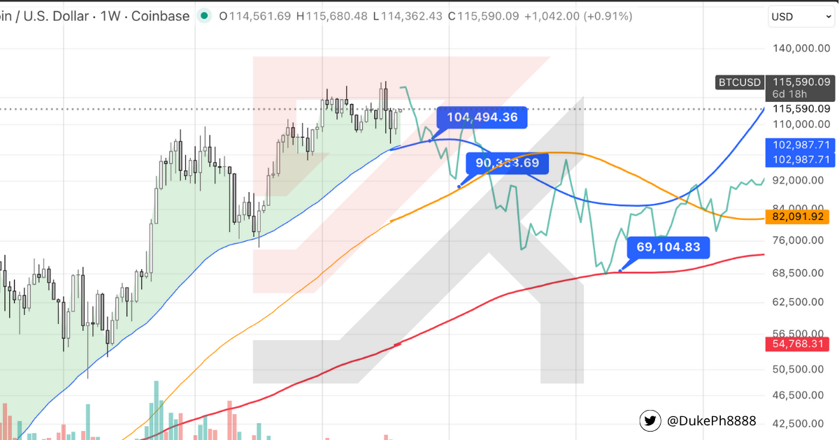 Xét theo kế hoạch ban đầu, vừa qua pha sụt giảm về $103K của $BTC mới chỉ gần đạt mốc ~20% tính từ đỉnh. Sau đó, $BTC đã bật tăng lại mốc $115K. Ở thời điểm hiện tại, đường MA50 khung tuần đã dâng lên $102,986, có thể nói pha điều chỉnh vừa rồi đã gần như tiệm cận khu vực MA50 này.