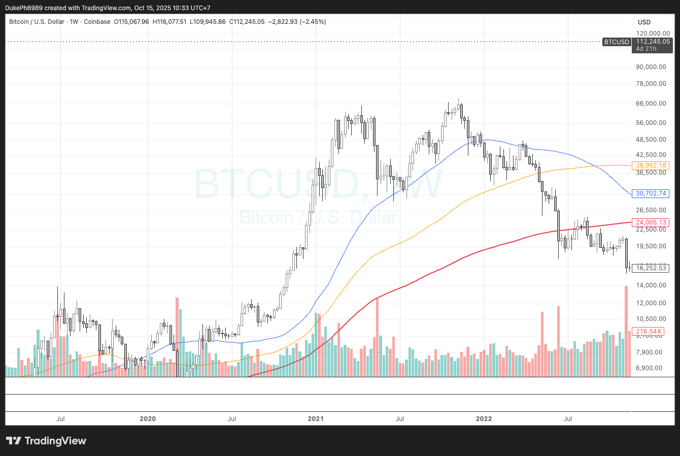 Với mindset này, vùng mua lý tưởng với Duke đó là ở MA200 khung tuần. Dĩ nhiên, ở thời điểm hiện tại, anh em nhìn thấy MA200 khung tuần đang ở $54K, nên sẽ có nhiều anh em sẽ nói rằng: