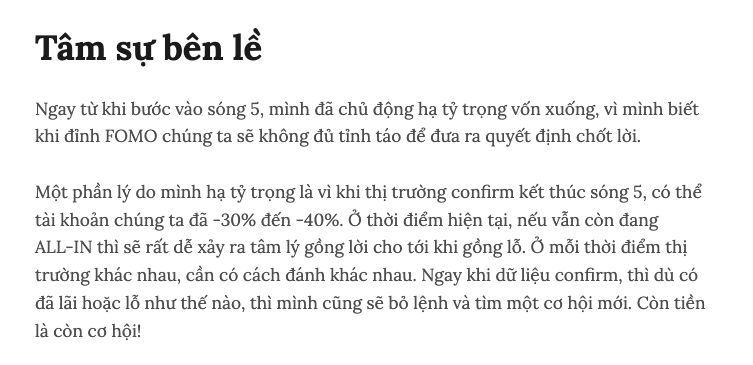 Với Duke, đây không phải là thời điểm để có mindset “MM chỉ đang cố rũ hàng mà thôi!”. Mindset này chỉ phù hợp ở sóng 1 và sóng 3. Đến sóng 5 mà vẫn nắm mindset này thì khả năng anh em không thể chốt lời hoặc cố gồng khi thị trường vào downtrend là cực kỳ cao!